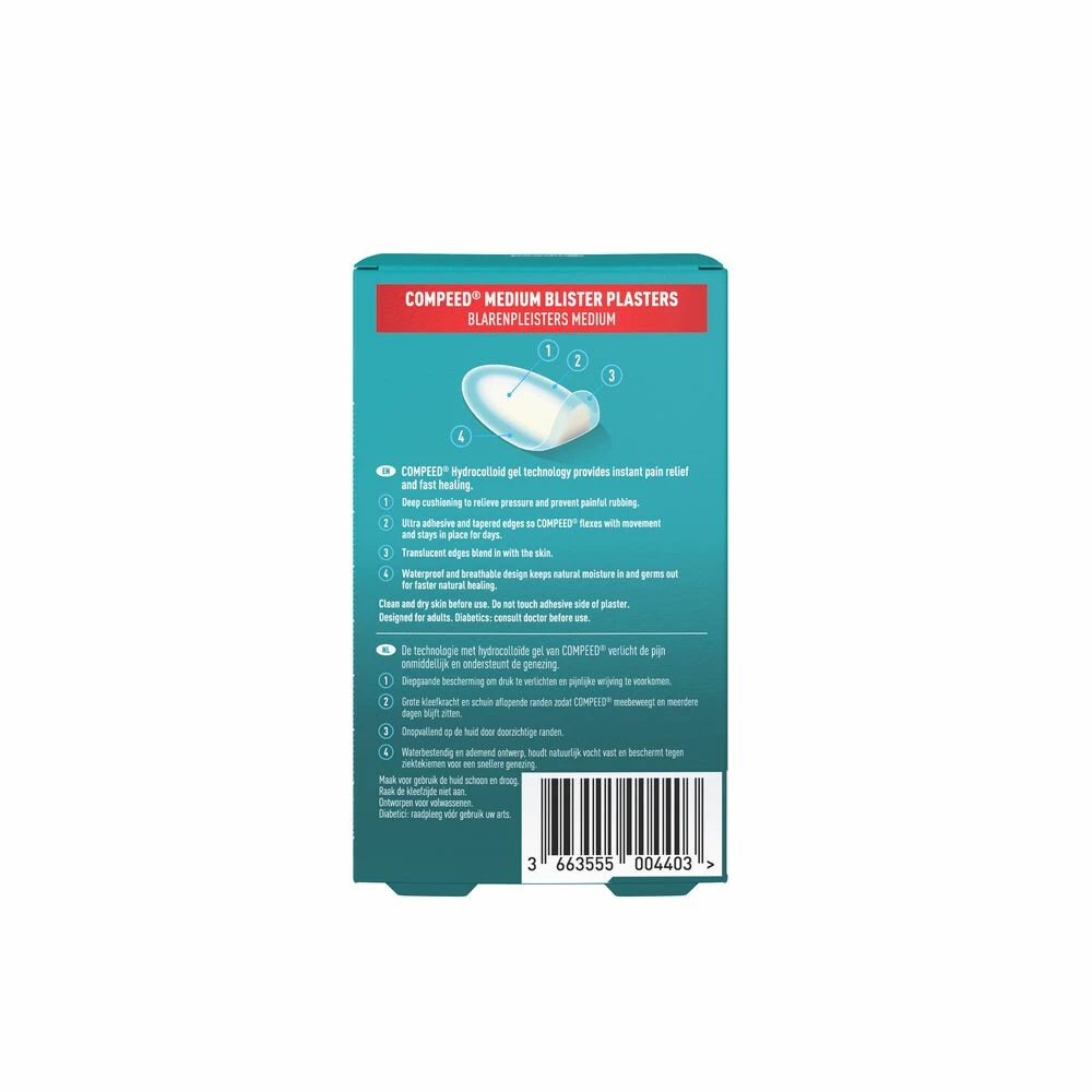 Compeed Blarenpleister Medium HielCompeed blarenpleisters zijn speciaal ontworpen voor op de hiel en zorgen voor een natuurlijke pijnverlichting van de blaar. De technologie met hydrocolloïde gel absorbeert overtollig vocht en vormt een beschermend kussentje. De pleister verspreidt de druk van de blaar waardoor de pijn onmiddellijk wordt verlicht en de omstandigheden voor de genezing optimaal zijn.Dempend gelkussen om de druk te verlichten en pijnlijke wrijvingen te voorkomenBlijft goe