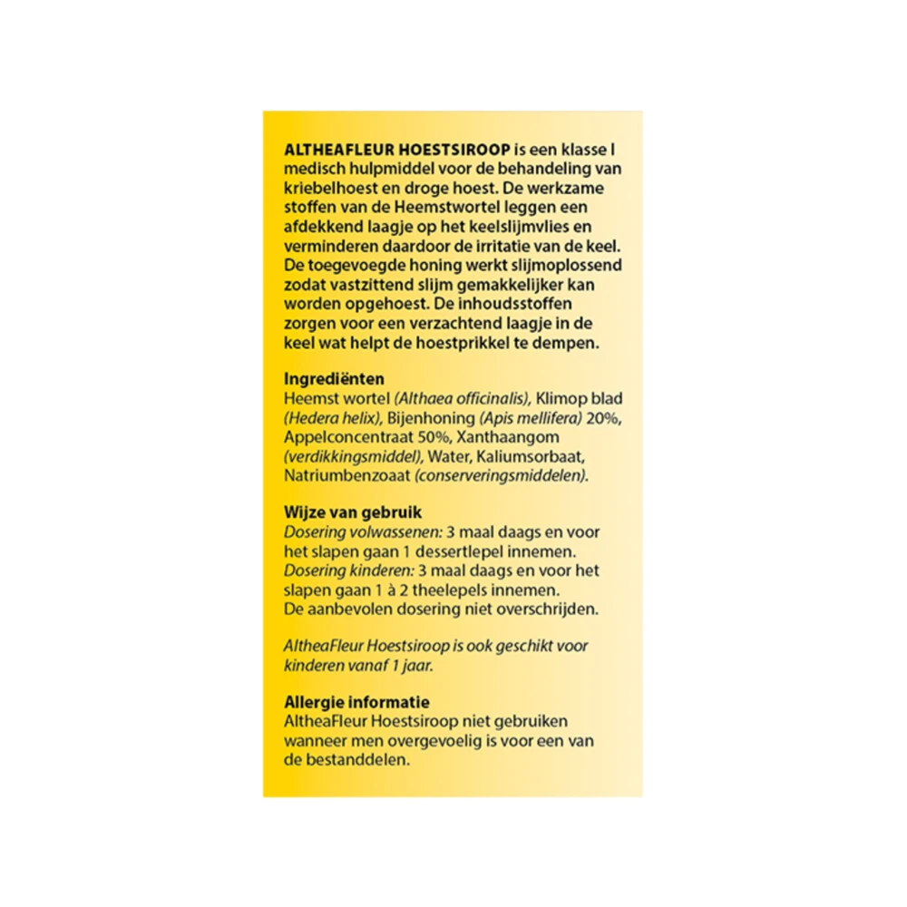 Bloem AltheaFleur HoestsiroopMedisch hulpmiddel Bloem AltheaFleur Hoestsiroop nr. 433 gebruik je bij een droge hoest, kriebelhoest en bij vastzittend slijm. De Heemstwortel in deze siroop legt een afdekkend laagje op het keelslijmvlies en verminderen daardoor de irritaties van de keel. De toegevoegde honing werkt slijmoplossend zodat vastzittend slijm gemakkelijker kan worden opgehoest. De inhoudsstoffen zorgen voor een verzachtend laagje in de keel wat helpt de hoestprikkel te dempen. Te gebrui