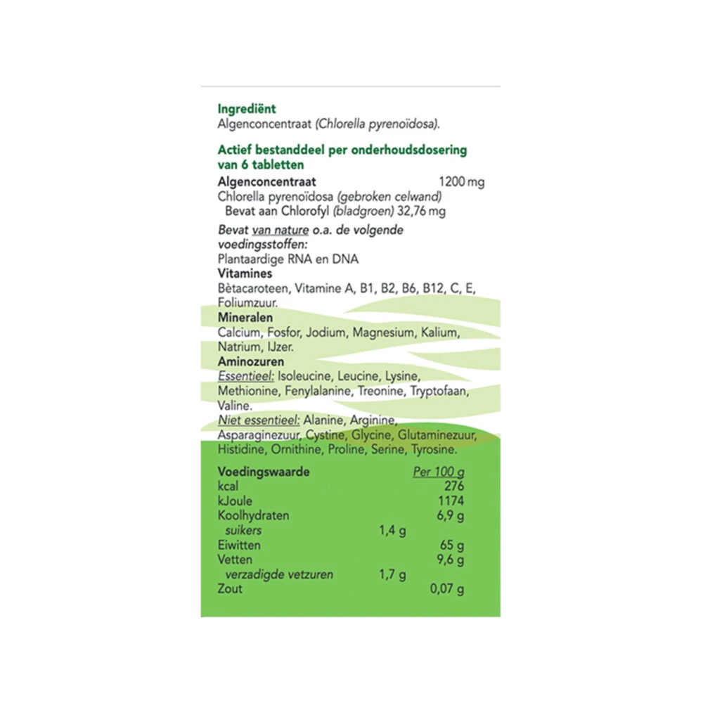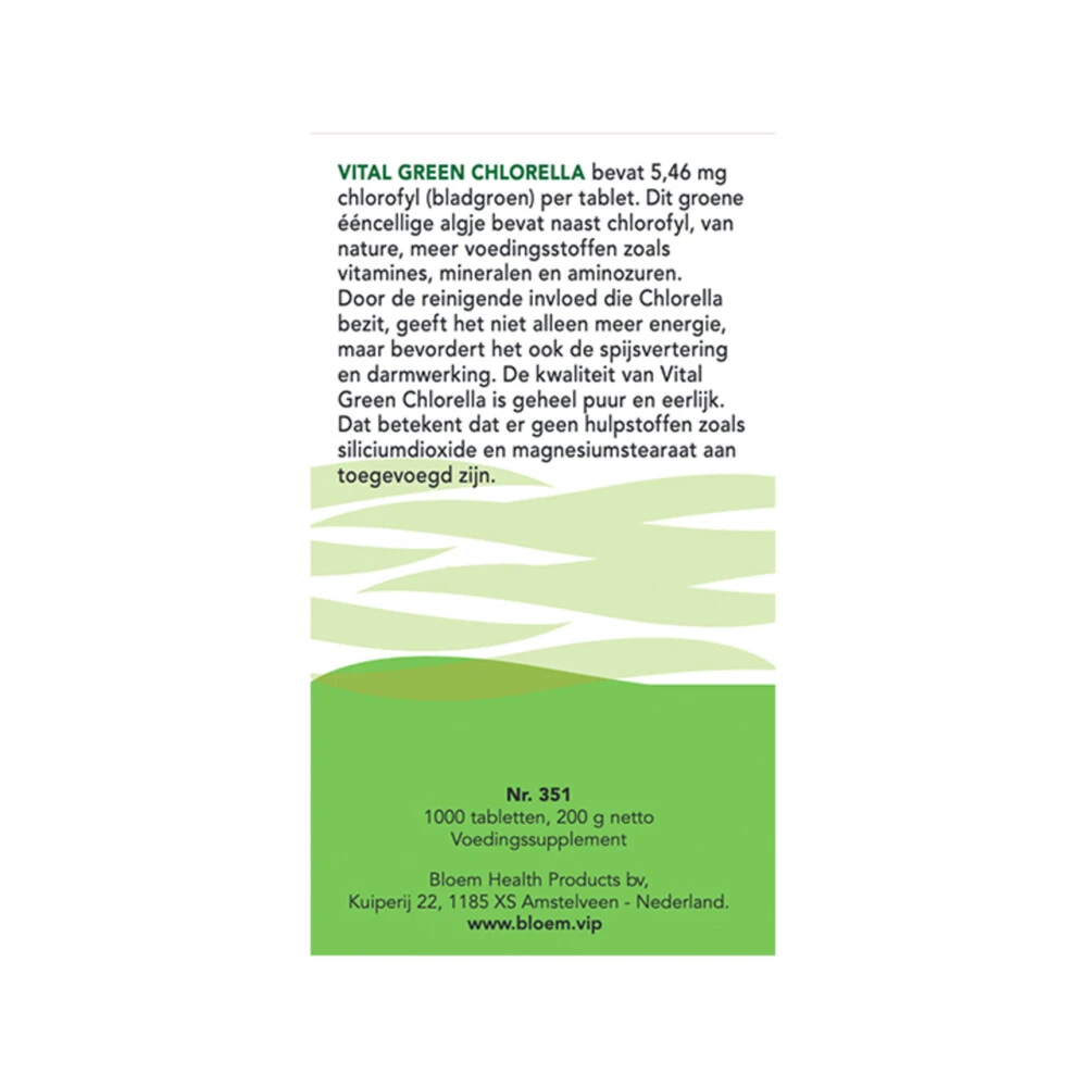 Bloem Vital Green Chlorella 1000 tablettenBloem Vital Green Chlorella is een kruidenpreparaat met 5,46 mg chlorofyl (bladgroen) per tablet. Dit groene ééncellige algje bevat naast chlorofyl, van nature ook voedingsstoffen zoals vitamines, mineralen en aminozuren.Door de reinigende invloed die Chlorella bezit, geeft het niet alleen meer energie, maar ondersteunt het ook de spijsvertering en darmwerking. Er zijn geen hulpstoffen zoals siliciumdioxide en magnesiumstearaat aan Vital Gr