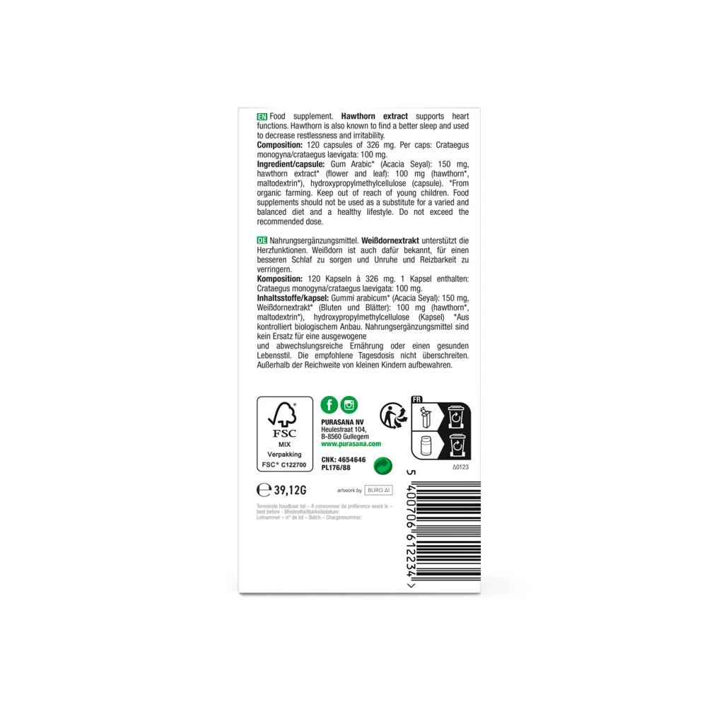 Purasana MeidoornMeidoorn zorgt voor een ontspannend en rustgevend gevoel, ondersteunt de bloedsomloop en helpt de bloeddruk in balans te houden. Meidoornbes is een vrucht met een hoog gedoseerd gehalte aan stoffen zoals flavonoiden, procyanidines, vitamine C, tannines, glycosiden en antioxidanten.Helpt optimaal te ontspannen.Ondersteunt de bloedsomloop.Houdt de bloeddruk in balans.